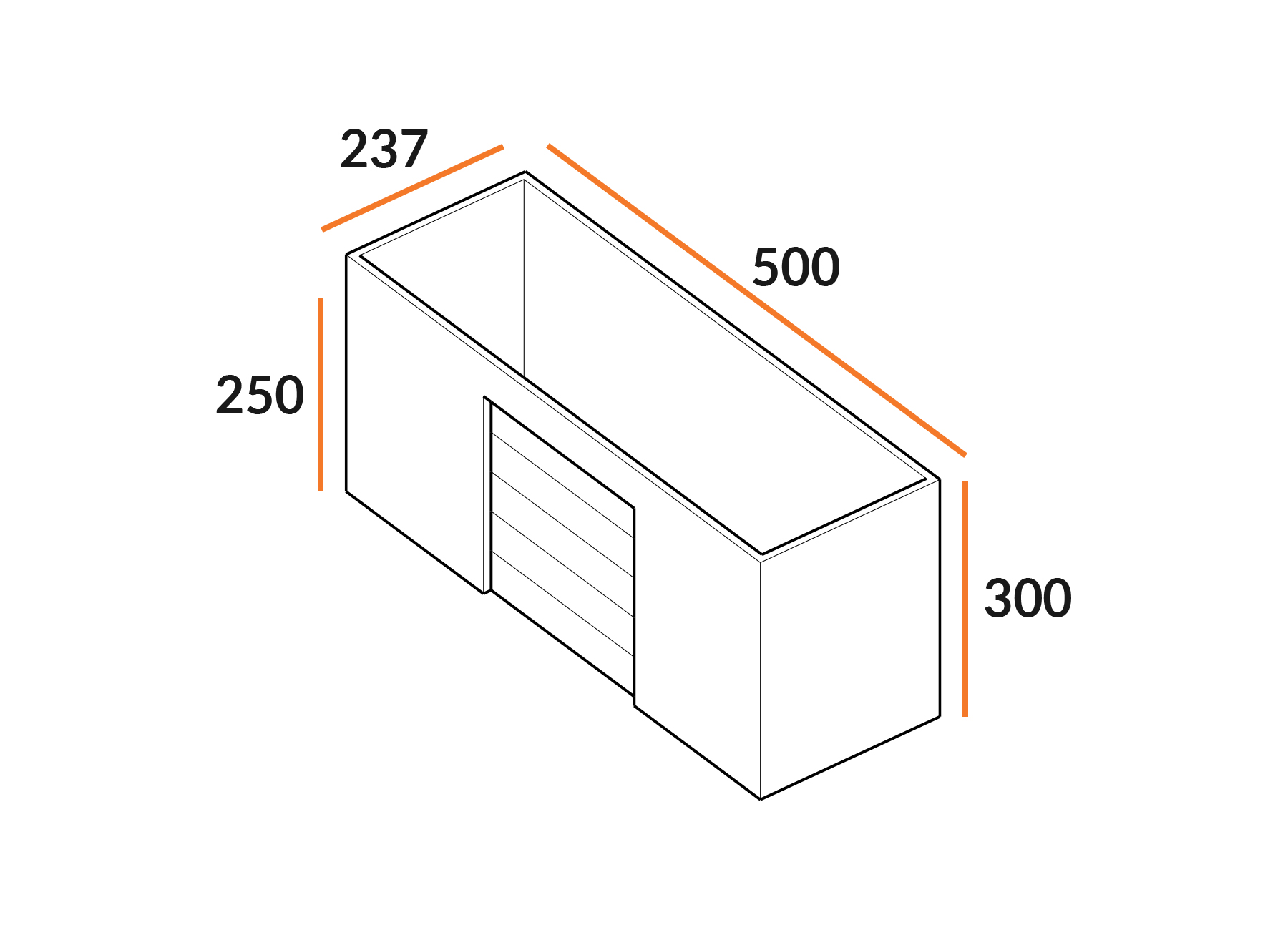De garagebox heeft een doorrijhoogte van 250cm en is gesitueerd op de 2e etage. De garagebox heeft een oppervlakte van 12m2. De afmetingen zijn 237cm x 500cm x 300cm (LxBxH). Let op: dit zijn buitenmaten.